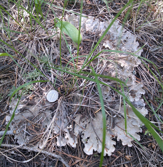 It must be the dryness of this environment that makes the species composition on some patches of ground look something like the edges of old Forest Service roads in wetter climes. Folious lichens like dinner plates, Cladonia, bits of Sedum, and sparse grasses along with tree litter try their best to keep the soil covered.